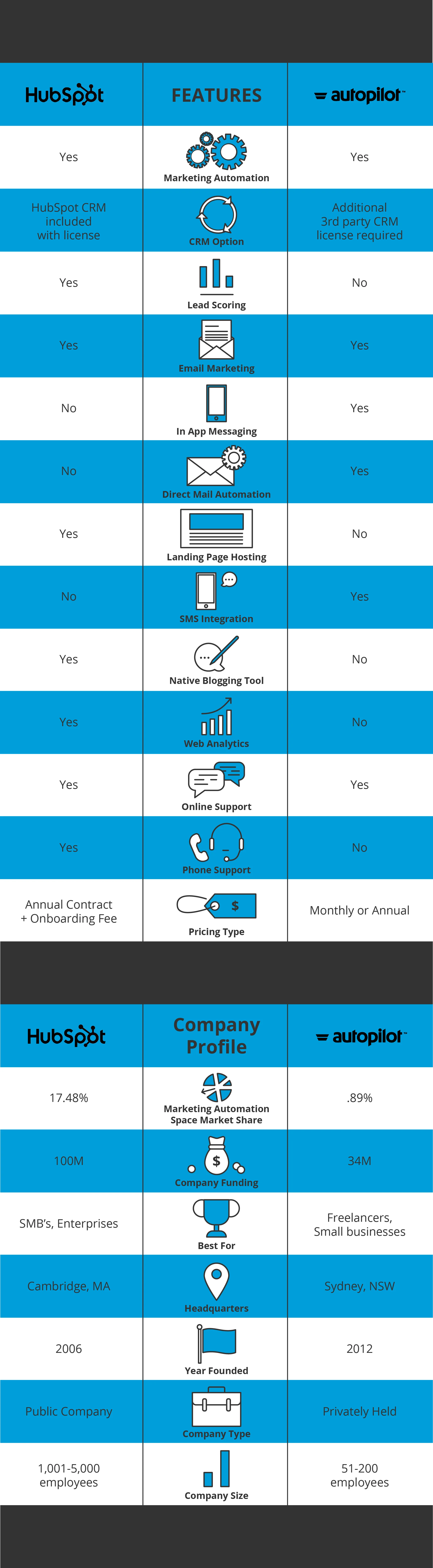 · For organizations looking for a monthly service without an annual contract, Autopilot makes the most sense. Hubspot requires an annual contract and has an onboarding fee.